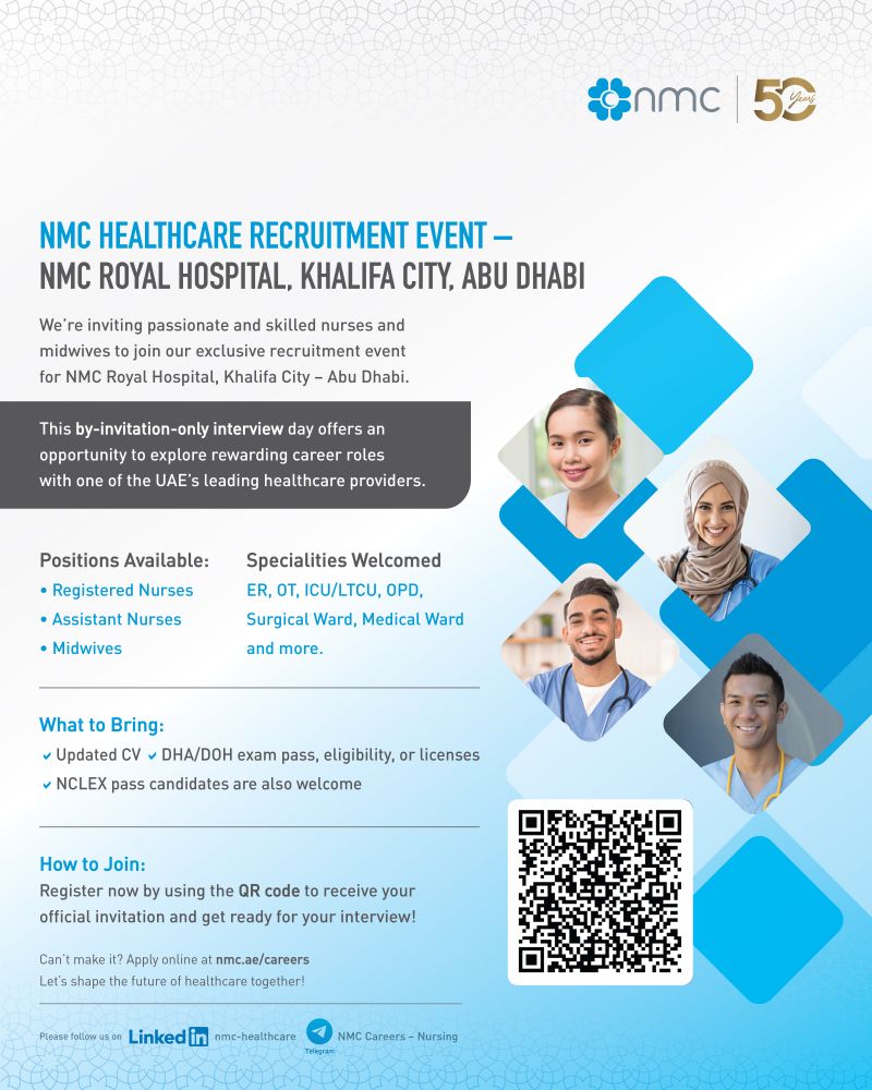 Join us for on-the-spot interviews and explore exciting opportunities with NMC Healthcare for NMC Royal Hospital, Khalifa City, Abu Dhabi region!