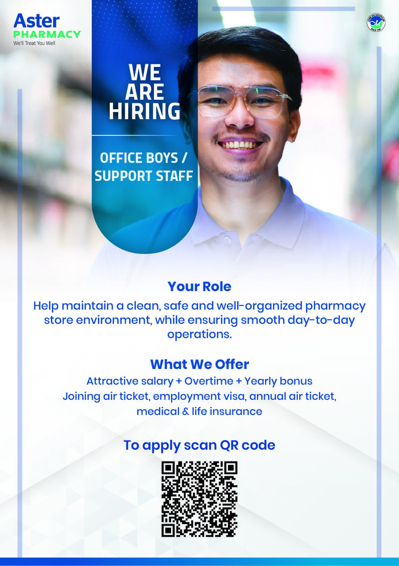 Aster Pharmacy is looking for committed Office Boys / Support Staff! Join our team and be part of a trusted healthcare brand.